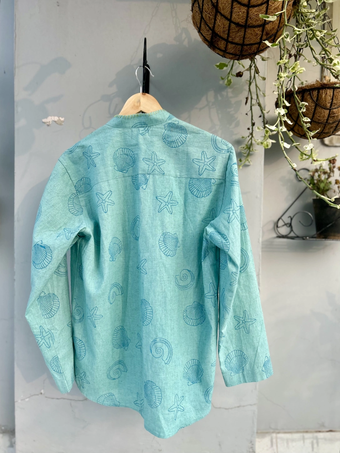 Experience unmatched style with our Aqua Blue Men’s Kurta. Beyond its essential wear, this statement piece boasts a bold 3-shell print for character and a touch of elegance with pink katha hand embroidery around the neck. Elevate your wardrobe, making a lasting impression with this unique and finely crafted kurta that seamlessly blends boldness and sophistication. Embrace the blend of everyday ease and subtle luxury with this meticulously crafted outfit.
