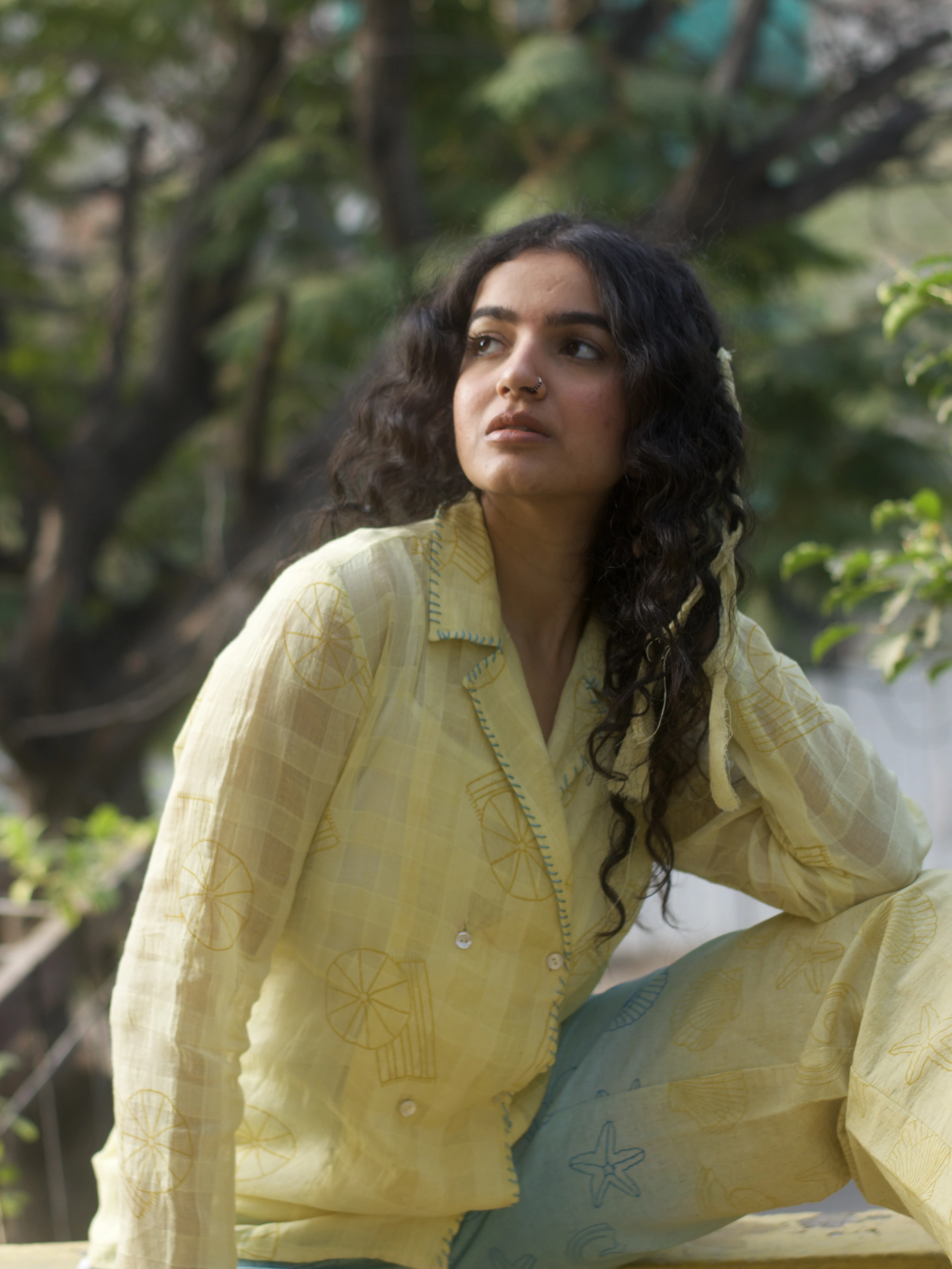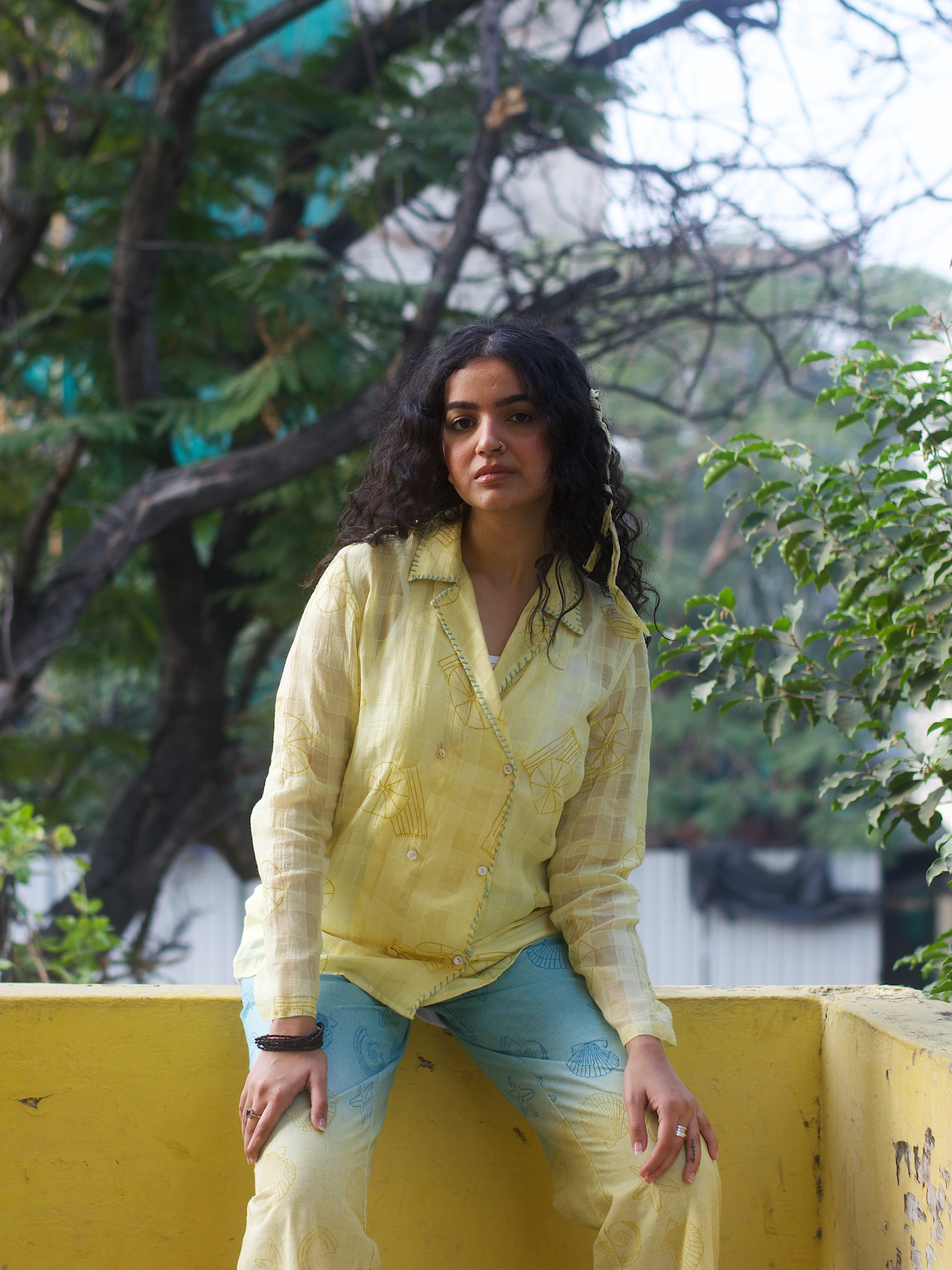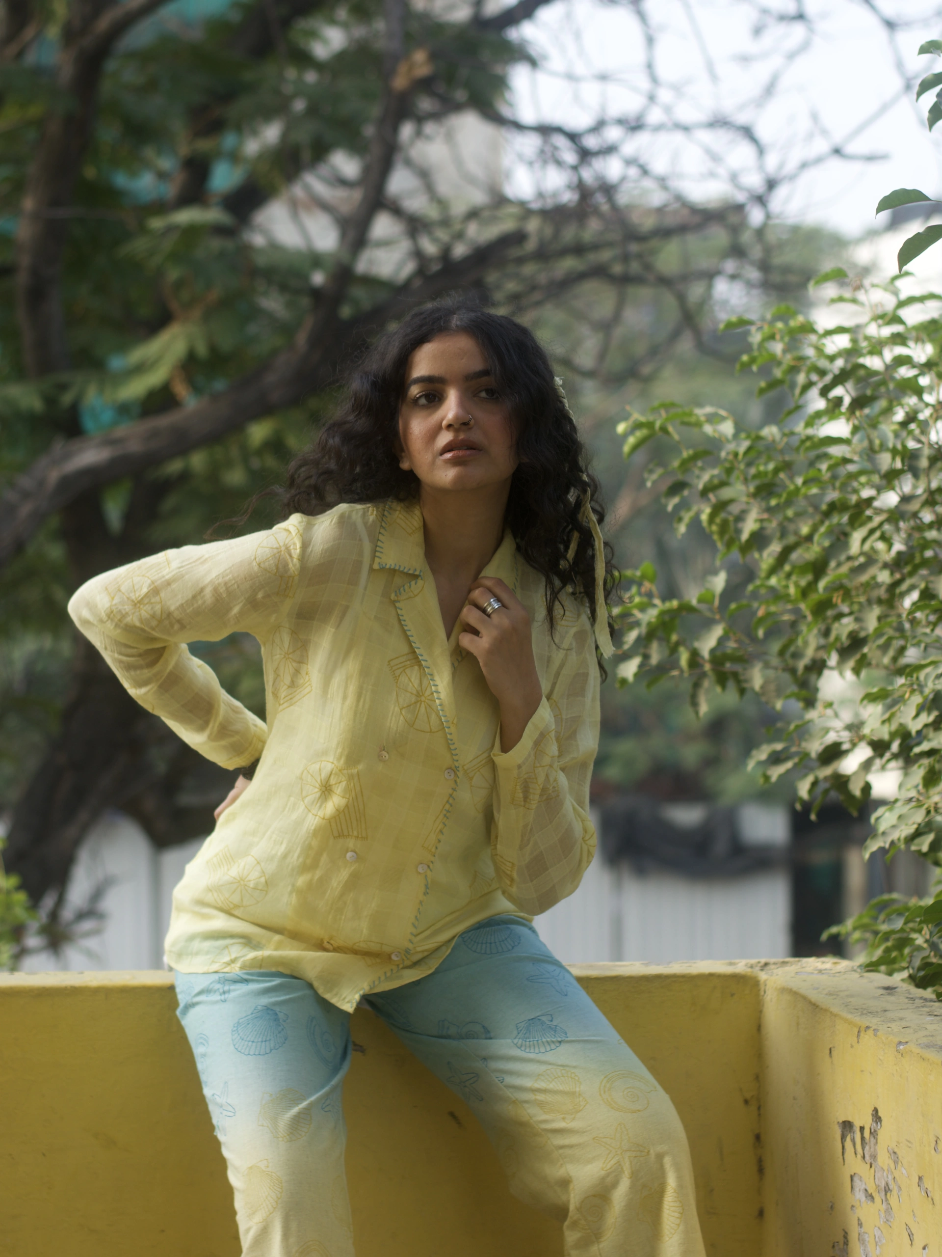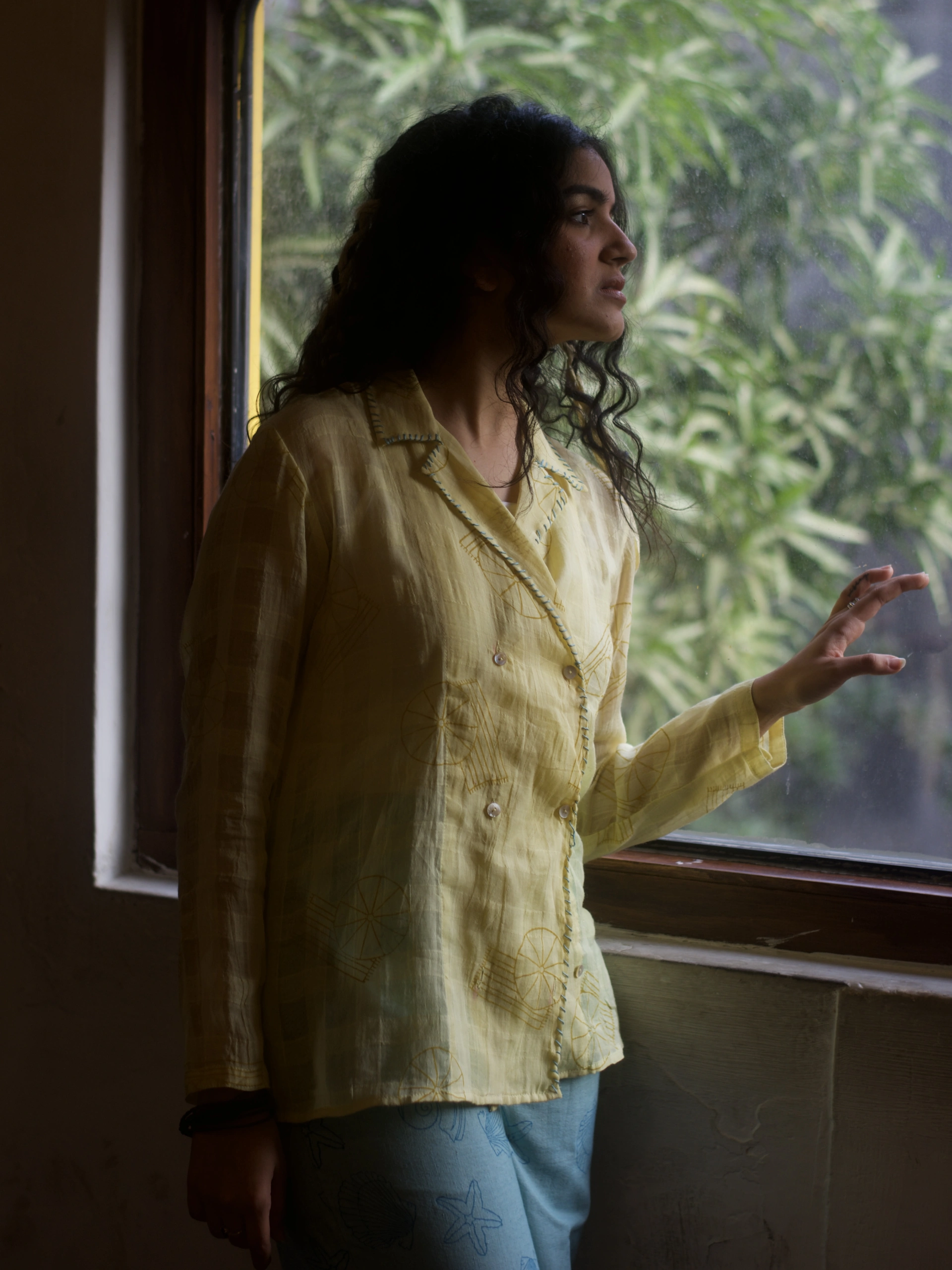 Elevate your coastal style with the “By the Beach” blazer, skillfully crafted from pure cotton sheer fabric. The playful chatri and mat print evoke a beachy vibe, transforming this blazer into a must-have for your daily wardrobe. Embrace the relaxed elegance and make a statement wherever your day takes you.