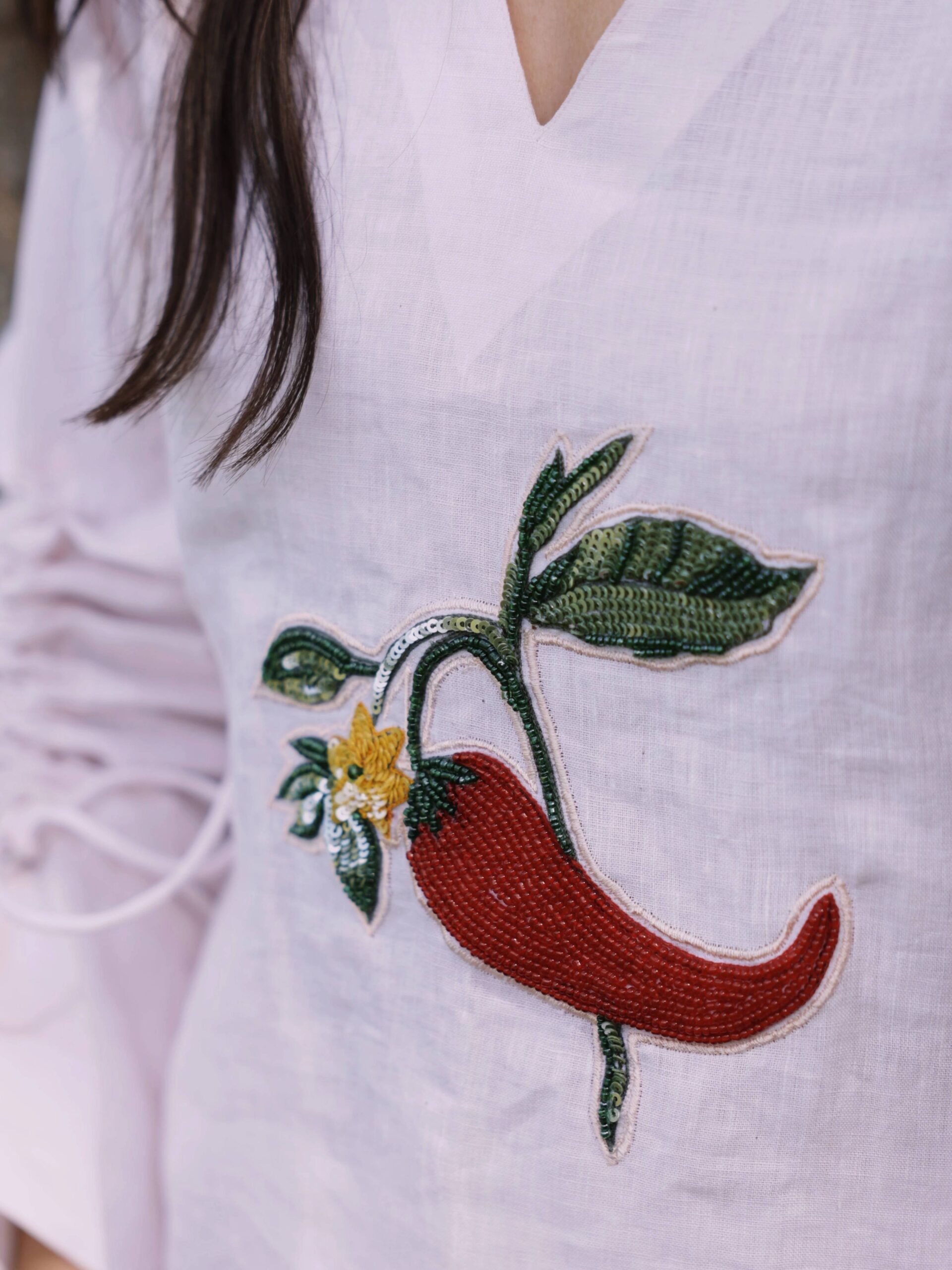 Intricately adorned with handcrafted chilli motifs, each detail adds a playful yet refined charm. The silhouette features a relaxed shirt with statement sleeves paired with chic cut-out pants, designed to elevate your everyday summer dressing.