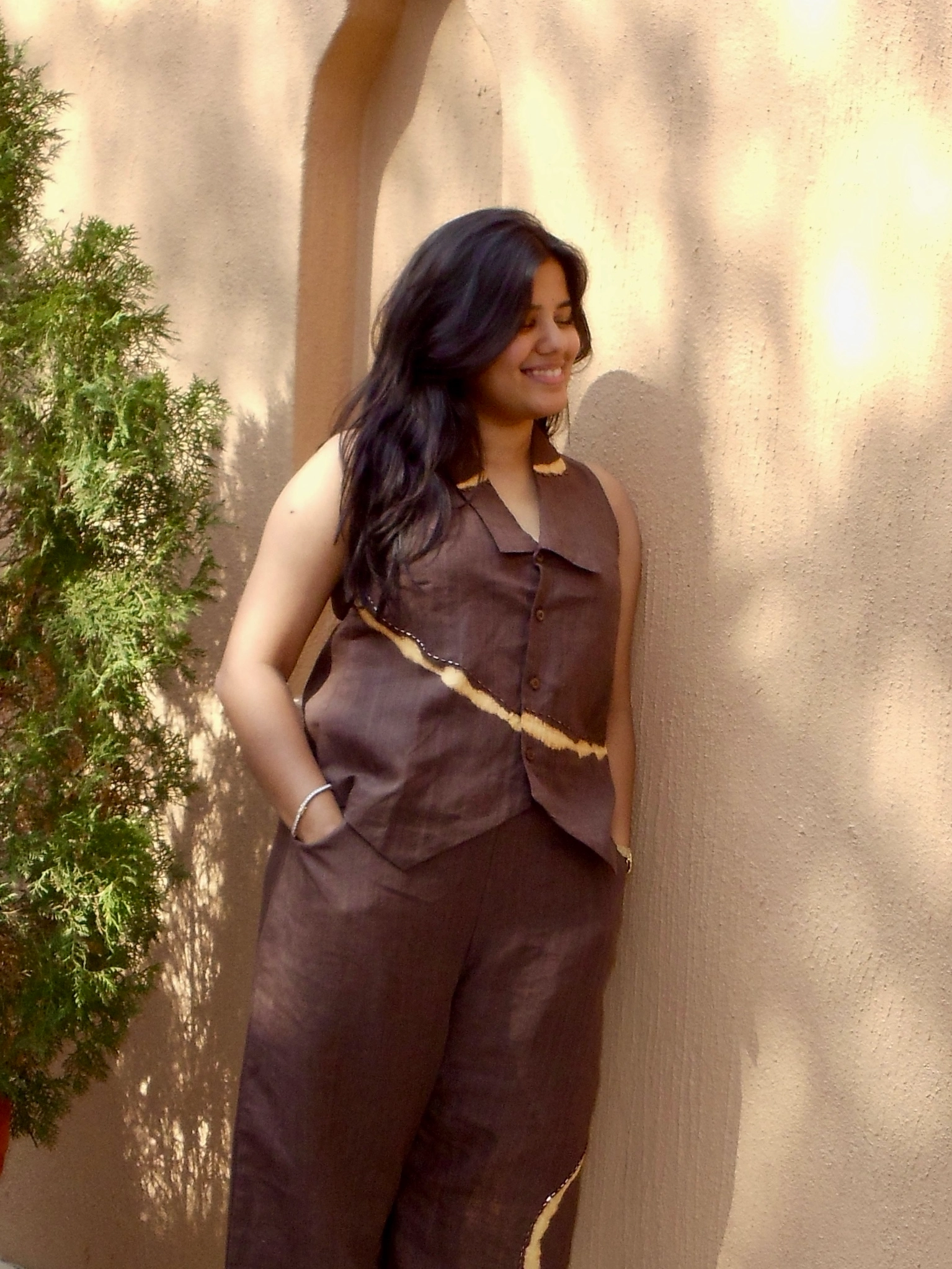 Our Eclipse Vest is crafted in pure linen for effortless comfort and breathability. Each garment is meticulously hand-worked using the discharge dye technique and thoughtfully embellished with delicate hand and Cutdana details, adding a subtle yet striking finish. Designed for everyday wear yet full of character, this set brings personality to whoever wears it. Clean. Edgy. Super versatile. A timeless statement you can style your way, from slow days to stepping out.