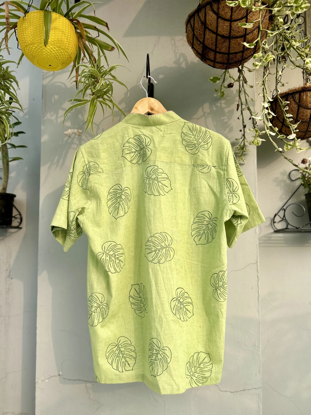 A pastel green island shirt featuring a bold monstera print with contrast hand stitch detail crafted from pure cotton for a refreshing and luxurious feel – a perfect choice for summery vibes. Embrace the blend of everyday ease and subtle luxury with this meticulously crafted outfit.