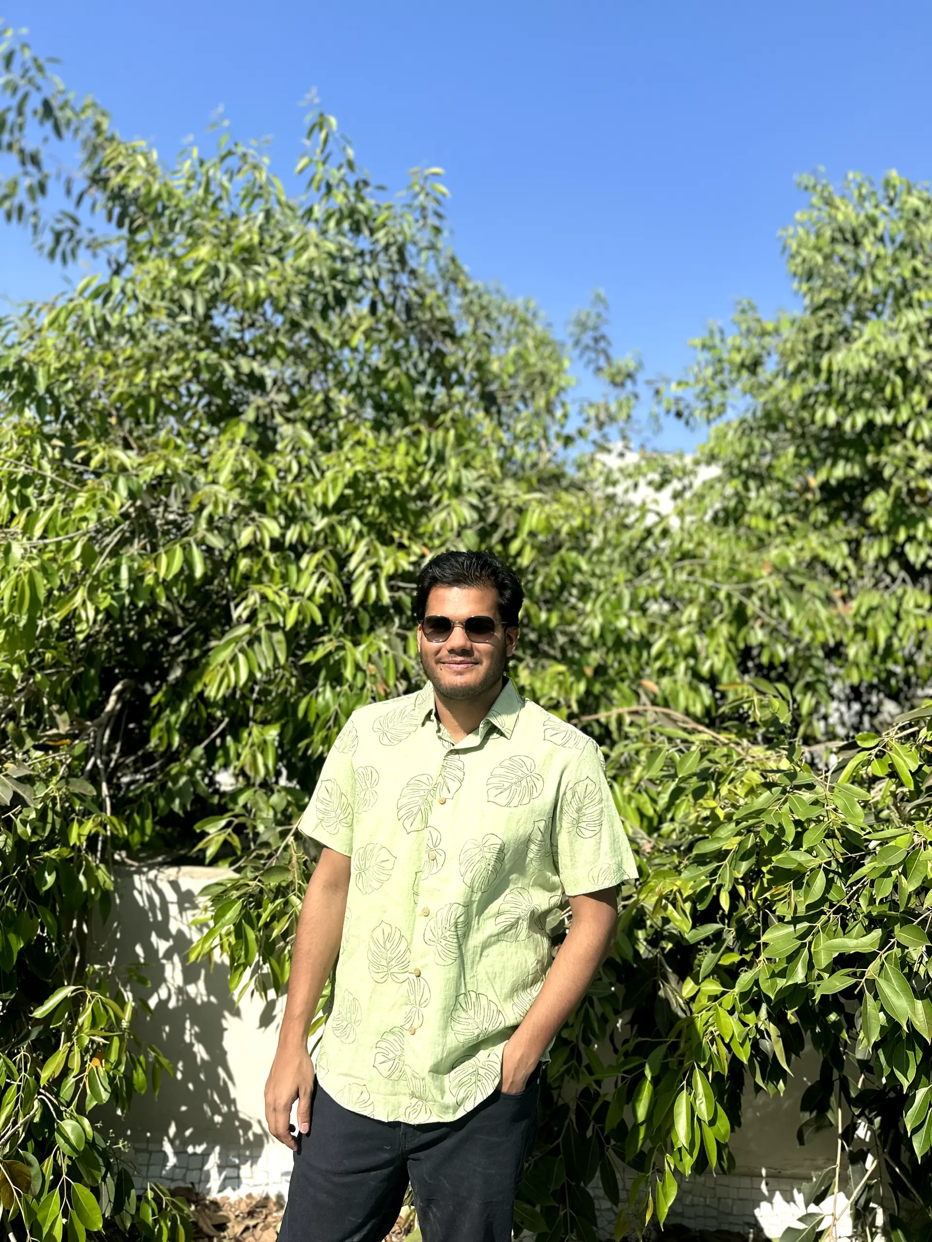 A pastel green Monstera Leaf Shirt featuring a bold monstera print with contrast hand stitch detail crafted from pure cotton for a refreshing and luxurious feel – a perfect choice for summery vibes.