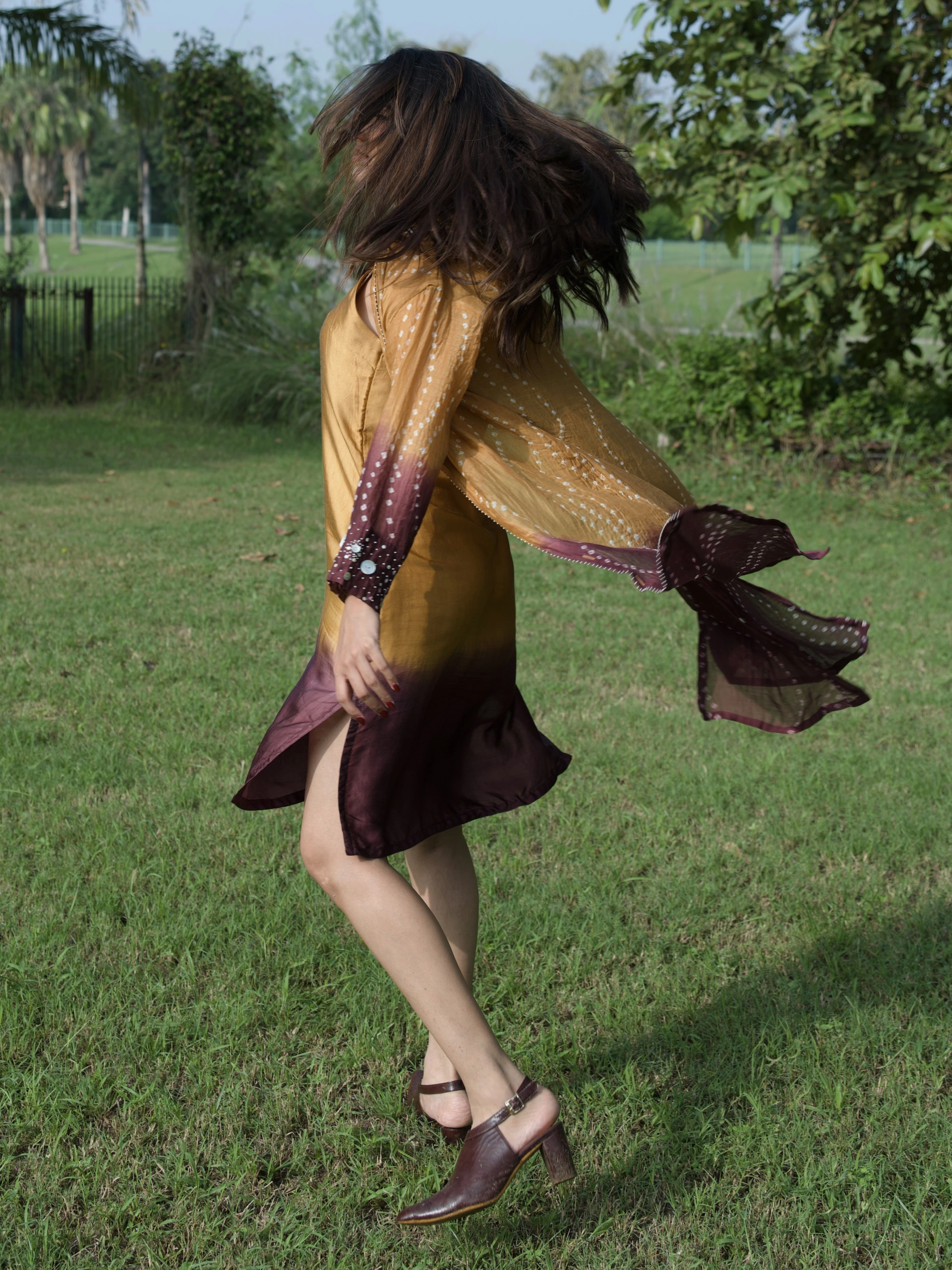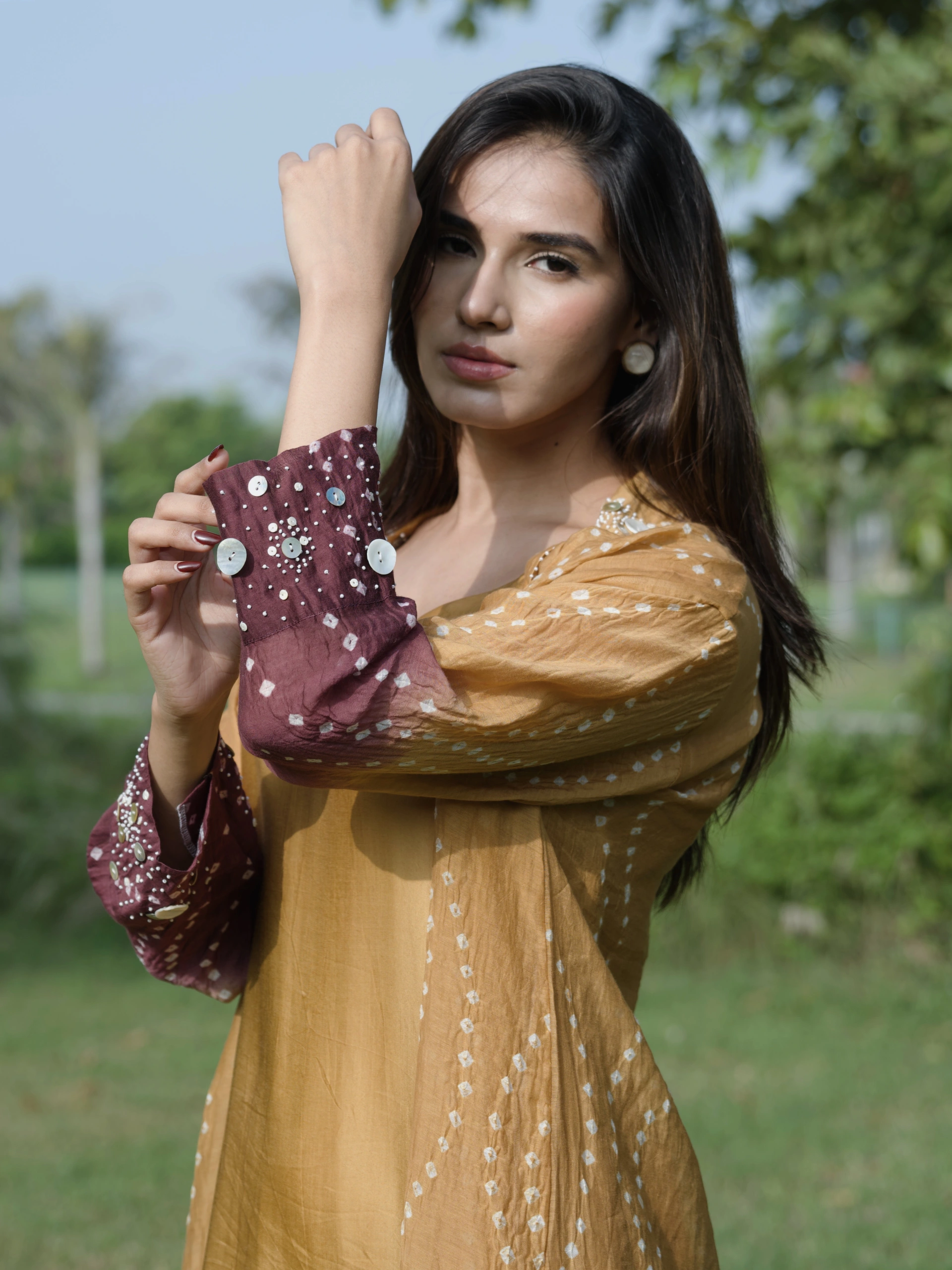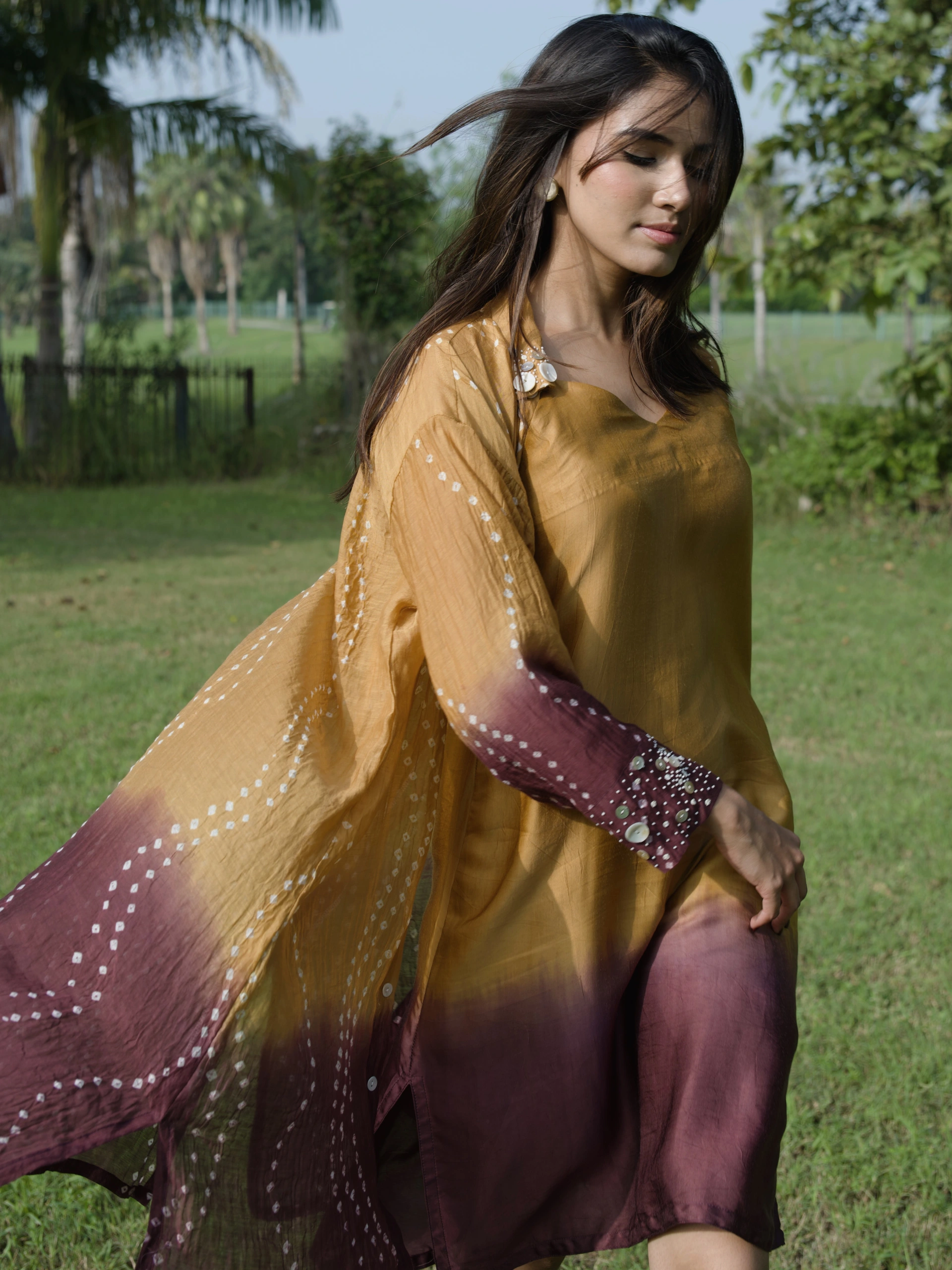 The Offbeat Ombre Dress stands out with its unique ombré hues and our signature wave Bandhani pattern. Paired with an ombré inner, it’s a versatile piece you can style effortlessly for any occasion.