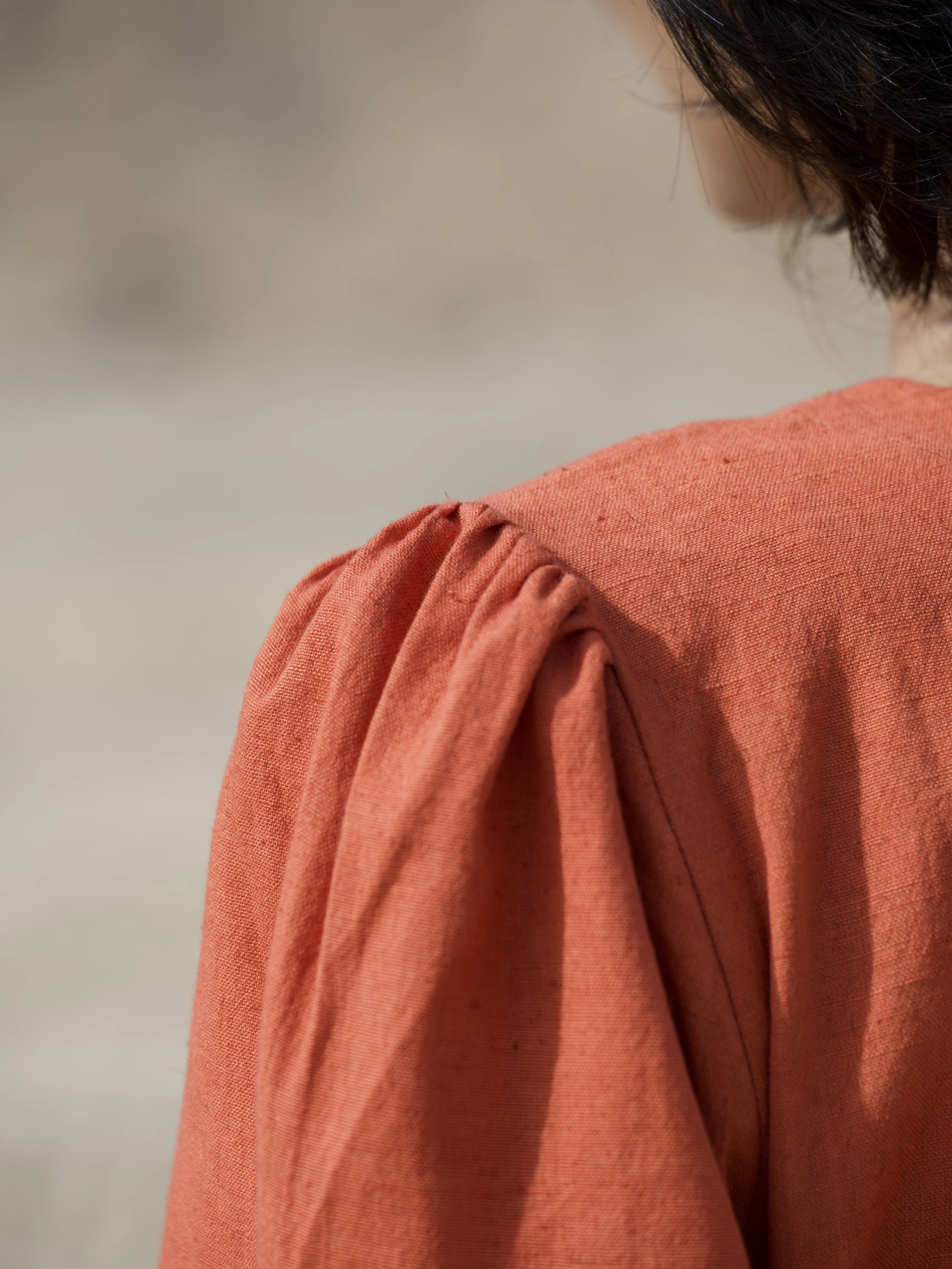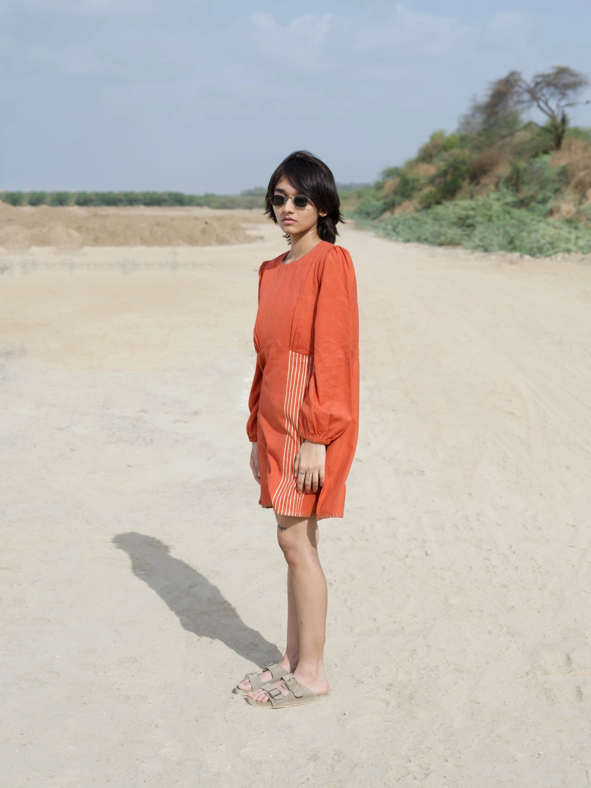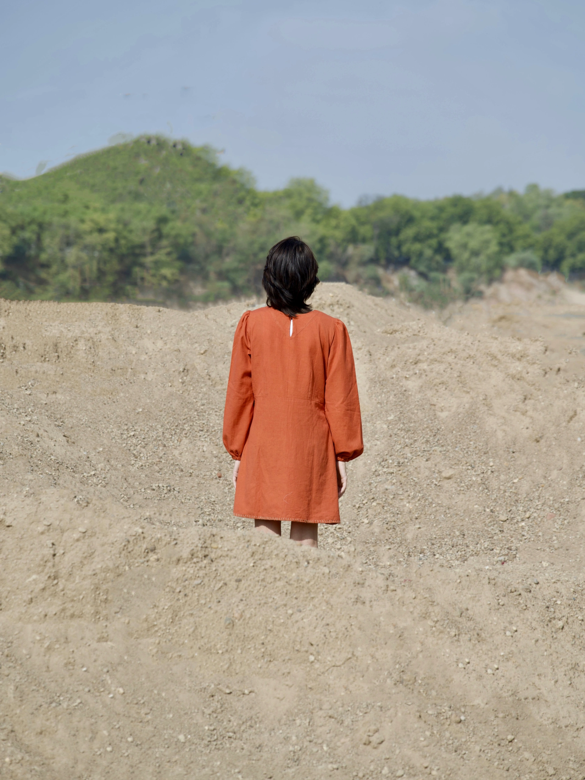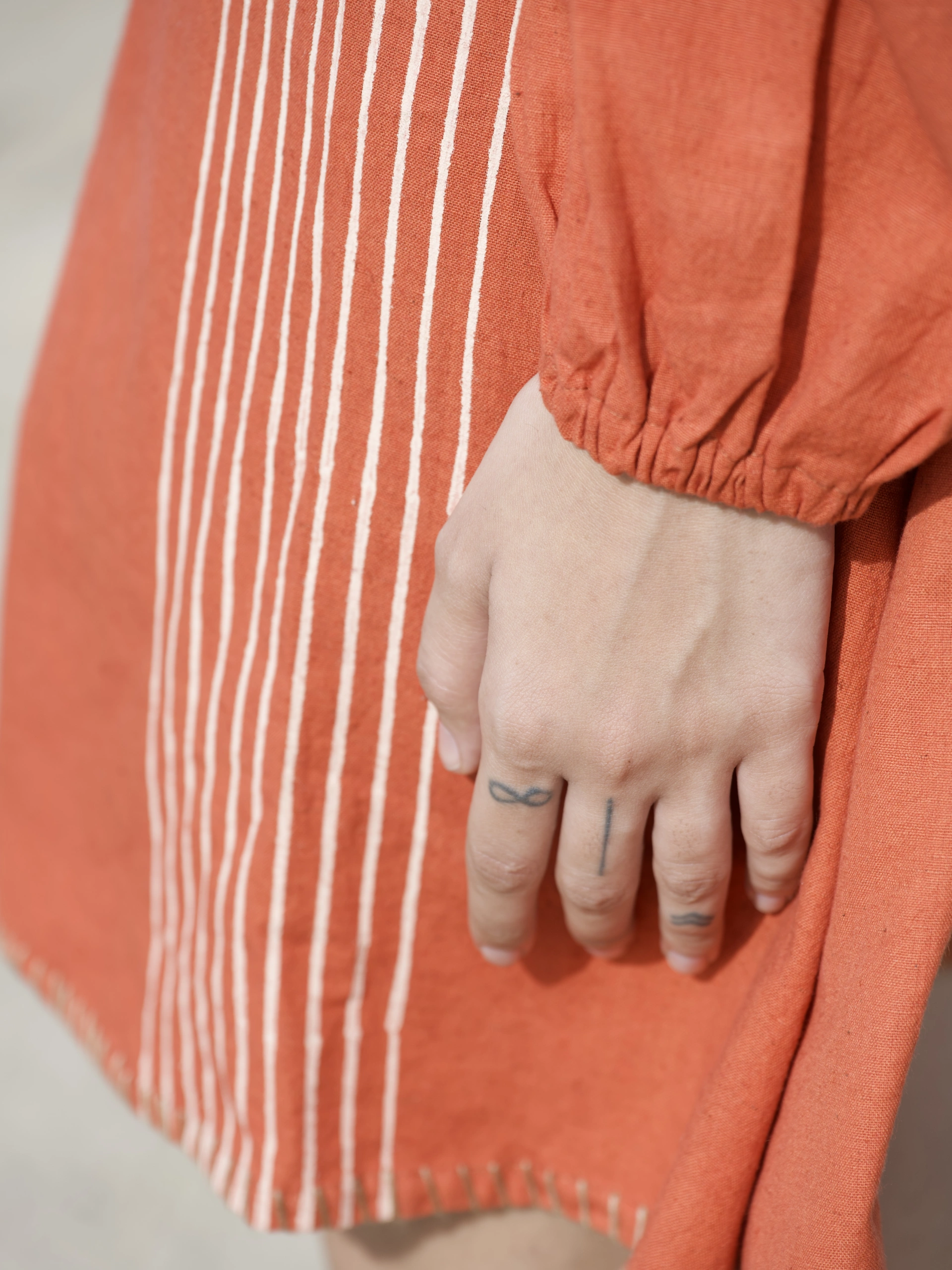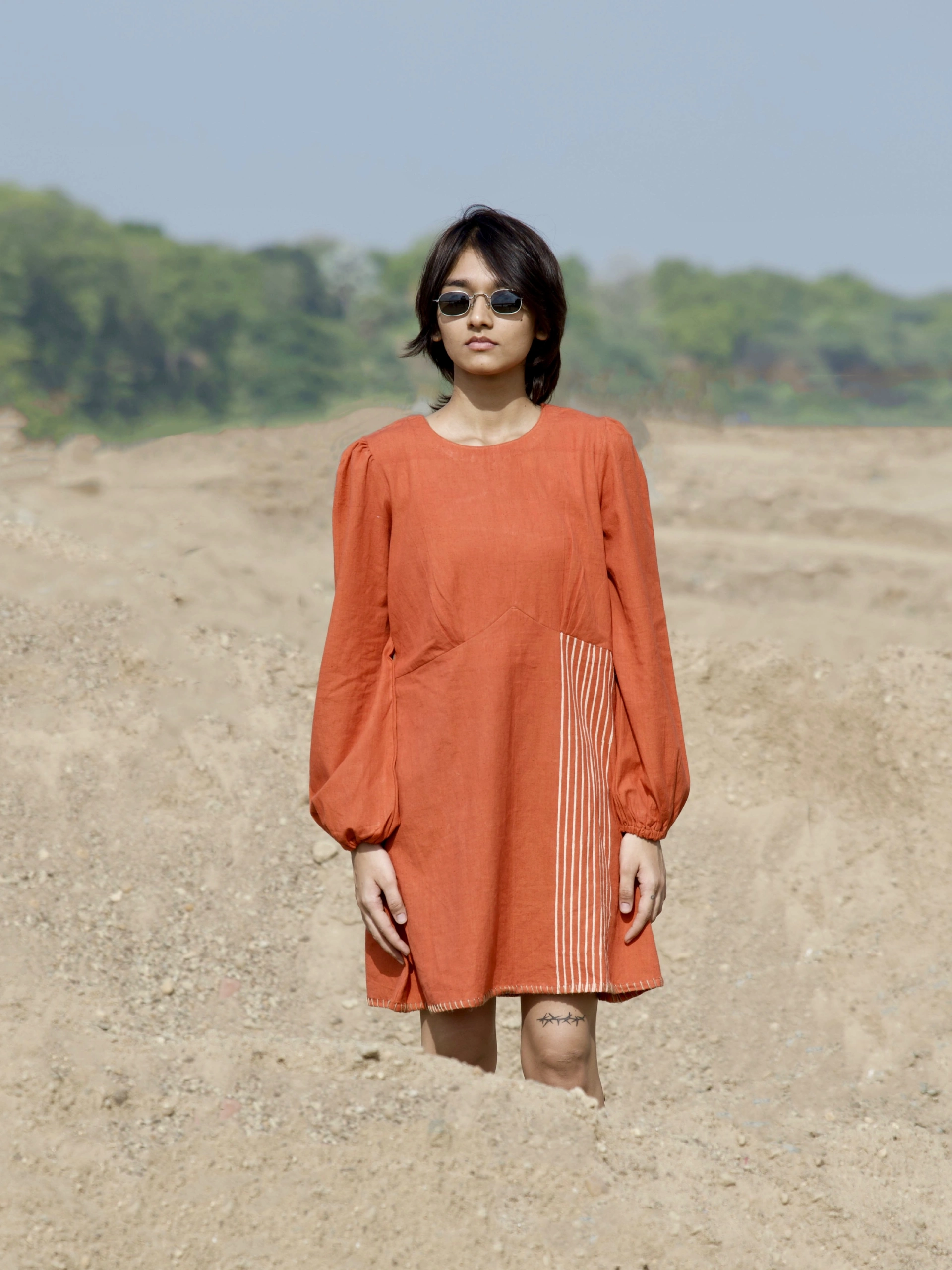 Raahi dress in earthy rust colour crafted in khadi cotton with refreshing pattern, symmetric placement artisanal block print and aesthetic details makes it an everyday effortless statement.