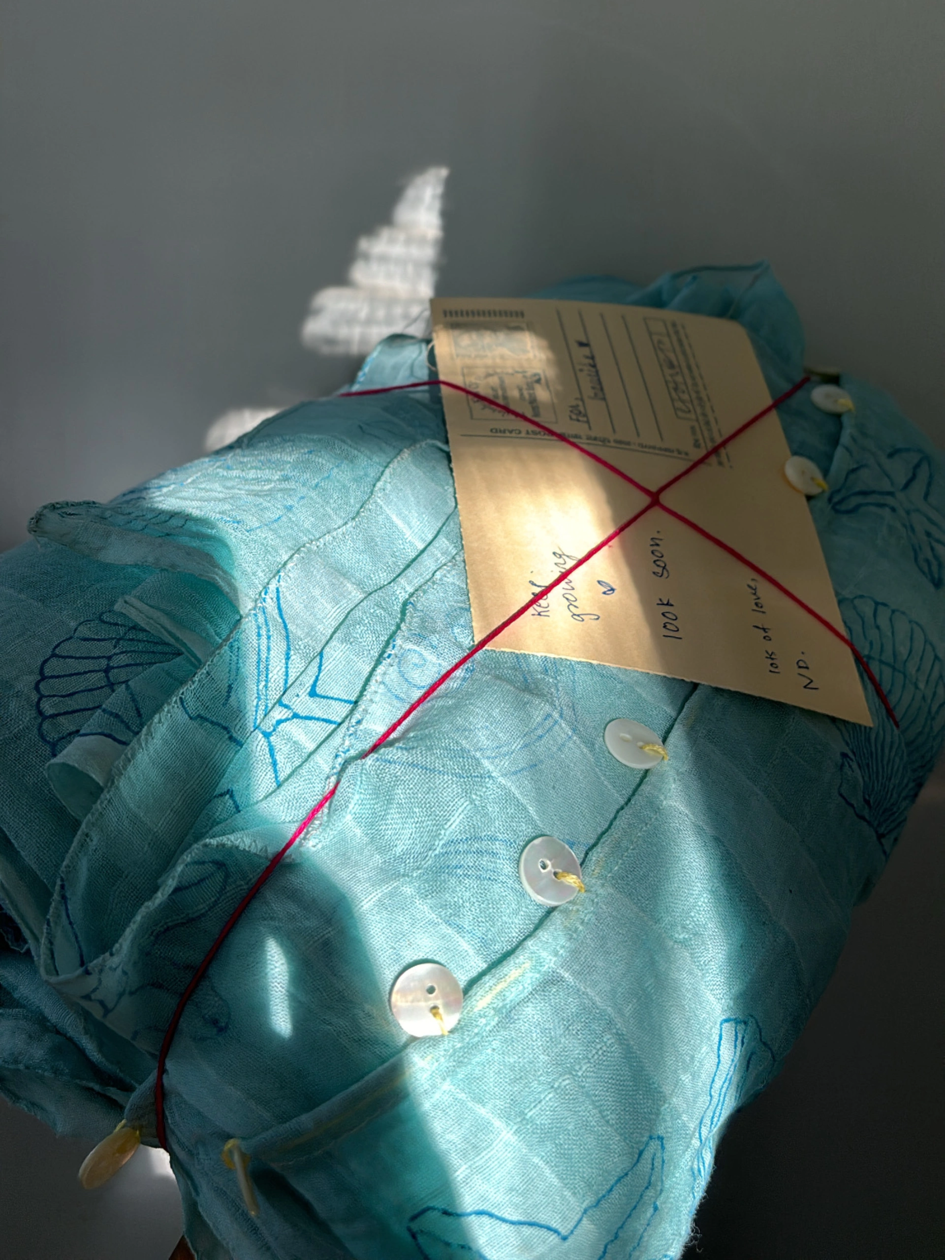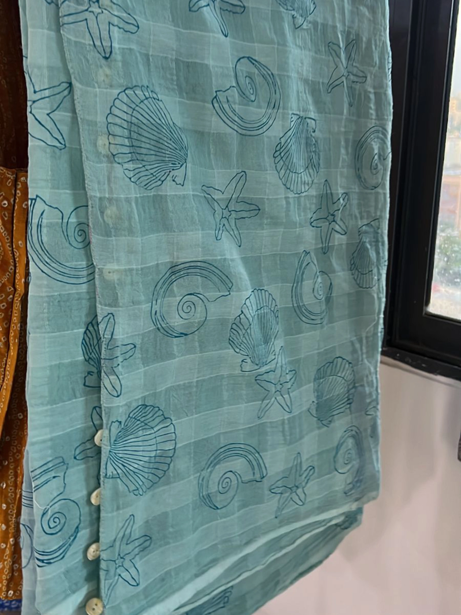 Dive into evening elegance with our Sea Shore Saree, a masterpiece in sheer aqua cotton. The delicate 3-shell print and the whimsical shell button detail at the bottom create a perfect blend of charm and sophistication. This saree is designed to bring a breath of fresh evening air to your wardrobe, making it an ideal choice for any occasion.