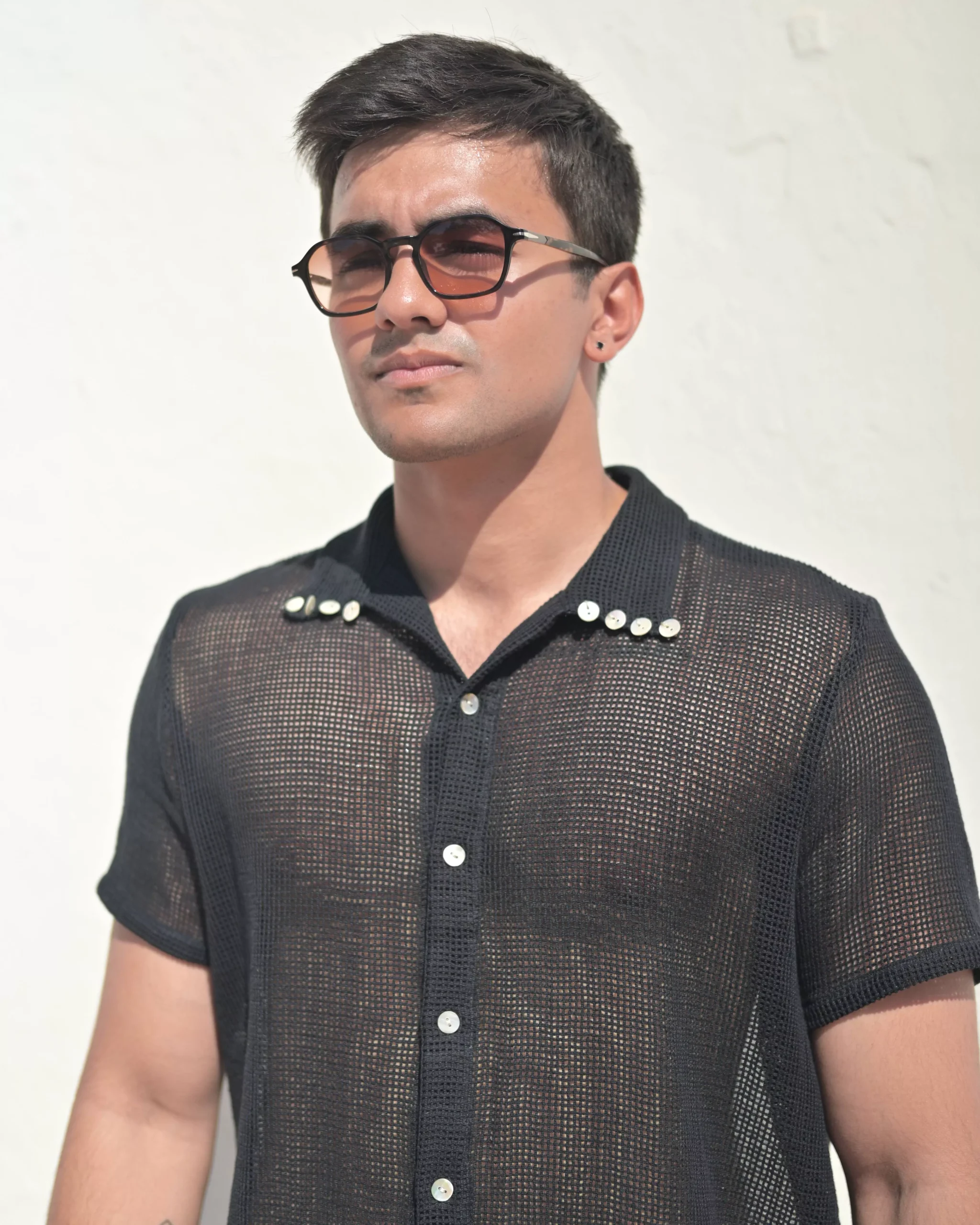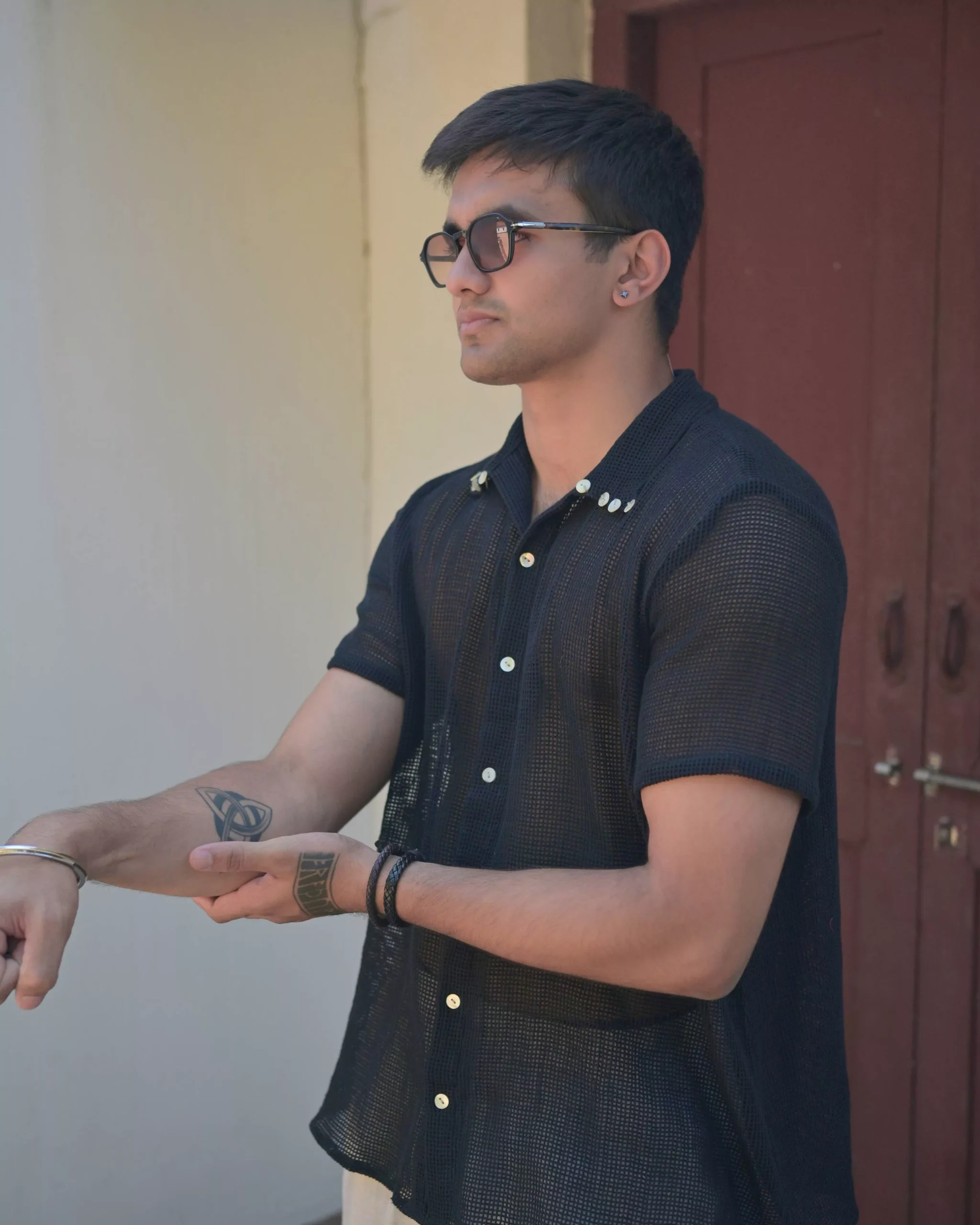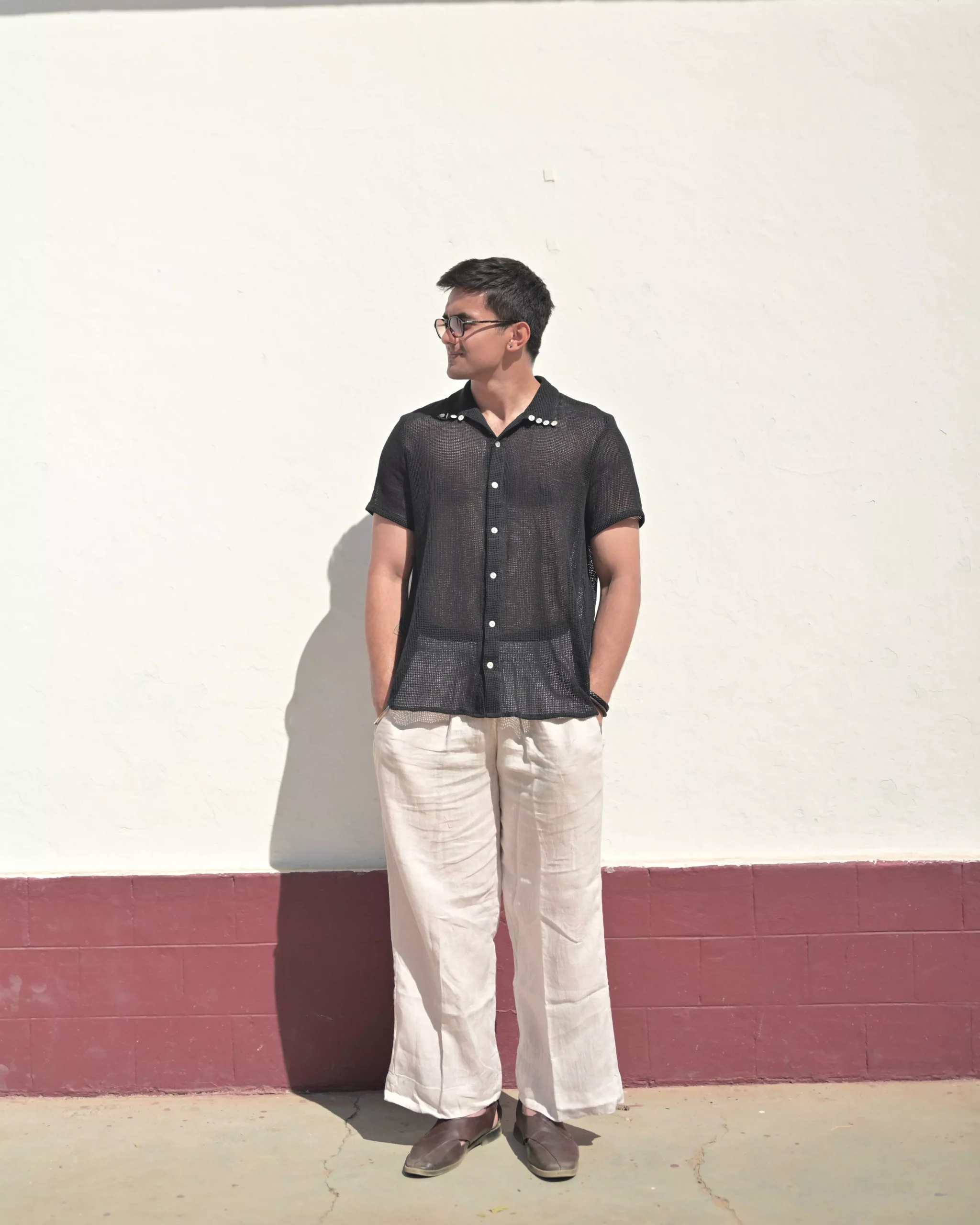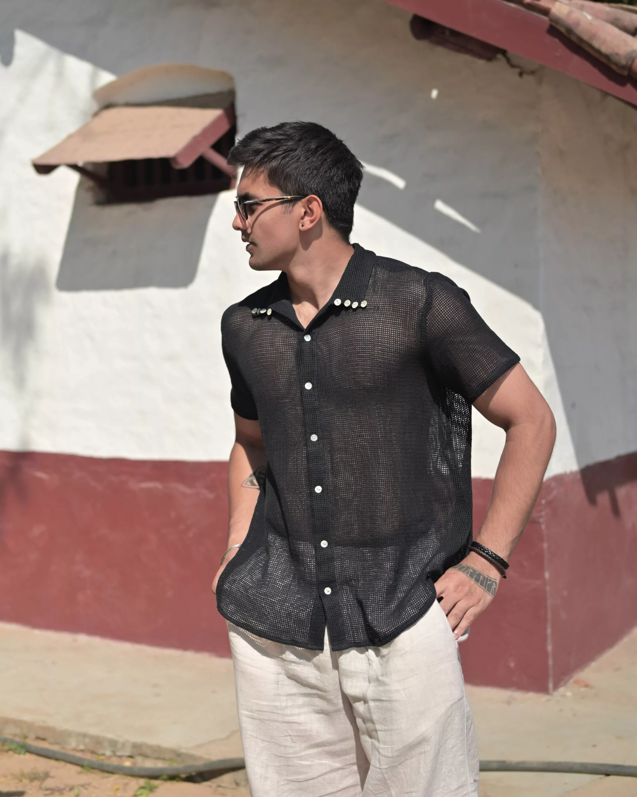 Made from cotton waffle fabric, the Unseen Sheer Shirt is a quiet symphony of texture and grace. The collar, adorned with button tassels, becomes a delicate statement, like a whispered secret between threads. Sheer and light, it moves with an effortless flow, revealing glimpses of artistry in its simplicity. A masterpiece in restraint, it invites the eye to discover its hidden layers with every glance.